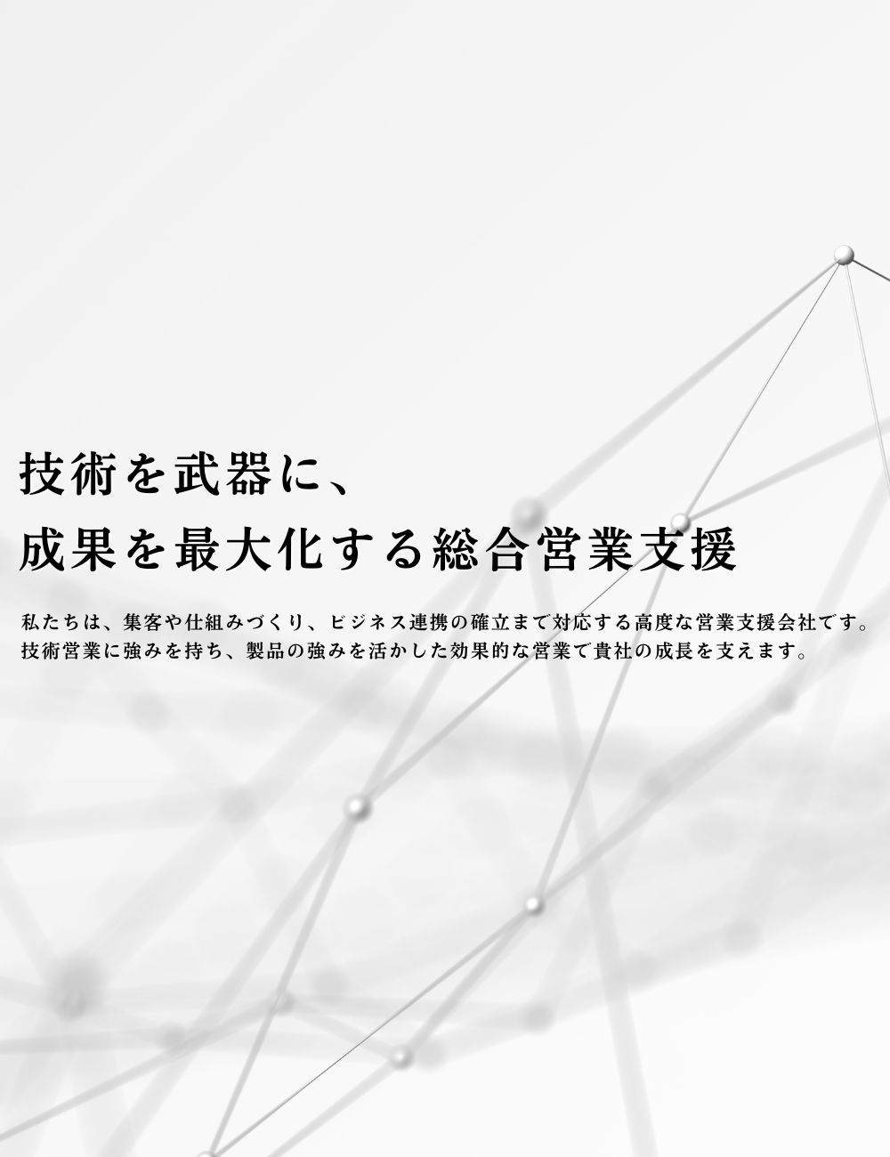 私たちの営業支援は、製品や技術を深く理解し、それを的確に顧客へ伝える『技術営業』を核としています。さらに、データ分析に基づいた科学的なアプローチで、安定して成果を出せる仕組みを構築します。